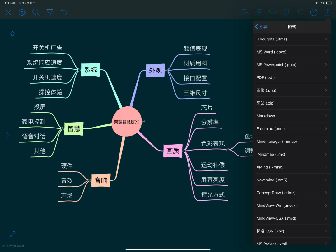 对于跨平台用户来说,分享是一个比较重视的问题。这一点在《iThought》上完全不用担心,右侧边栏支持图片、PDF、xmind等等二十多种导出格式,完全能够满足普通用户的需求。