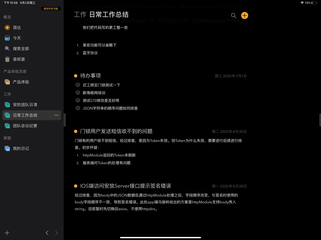 你也不必担心日记和工作中的记录混淆,因为在日期这个维度之上,《Agenda》支持以项目来分类,我们可以把它当作笔记本来使用。像我就分为三个笔记本,工作每日总结、个人日记以及团队会议纪要,十分清晰。
