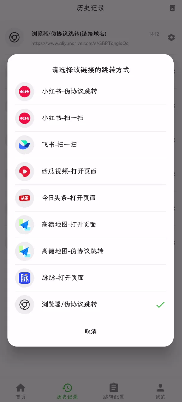 如果在不想登录的电脑上看到阿里云盘上资源,用浏览器生成二维码,想在手机上直接保存,可以选择软件里的浏览器/伪协议跳转,就能在扫码的时候直接跳转到阿里云盘,不会经过浏览器,整体非常快捷,也可以在后台能看到只有两个软件。