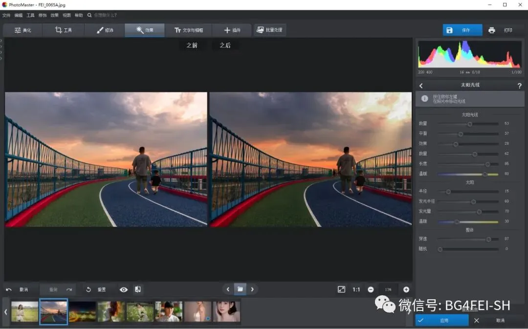 软件拥有一键换天空的功能,同时凭借一键抠图的功能也可以轻松换背景的,还可以跟下图一样增加真实的太阳光线,在 PhotoMASTER 程序中,可以调整每个阴影的参数,为照片创造新的氛围。在阴影的帮助下,改变一天中的时间 – 从白天的照片,你会得到一张晚上的照片。改变颜色,饱和度,调整色调强度。结果会完全不一样