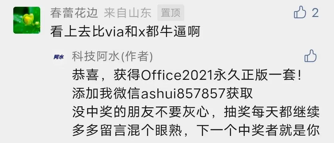 昨天中奖粉丝如下,阿水每天会在点赞+留言的粉丝中,抽取一位赠送Office2021永久正版一套,并置顶留言公示,请大家踊跃参与!