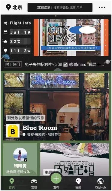 光看首页的界面,就可以感受到旅行的气息。mars推荐的店一般都是比较小众、比较有格调的店铺,在这里你能发现东京更好吃的汉堡、上海随时可能关门的书店,纽约超酷的rooftopbar等各种你意想不到的惊喜。Mars的项目总监说过,他们的目标就是带用户去那些”如果你不用 mars 可能一辈子都不知道”的地方。