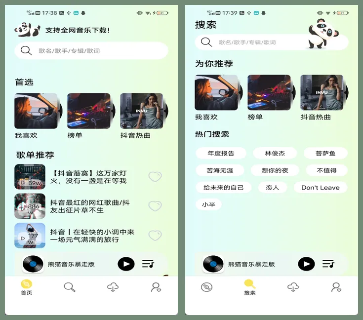这款软件的界面设计独具匠心,呈现出一种简洁而不失精致的美感。踏入首页,一系列榜单与热门推荐映入眼帘,宛如一幅精心绘制的音乐画卷。其中,风格各异的歌单,仿佛是音乐世界里的一个个小天地,引领着用户探索不同的音乐风格;热度榜则如同一面镜子,清晰地映照出当下音乐的流行趋势;而单曲推荐,恰似夜空中闪烁的繁星,不经意间便能点亮用户心中的音乐之光。软件还配备了强大的搜索功能,无论是输入歌曲名还是歌手名,都能迅速定位到目标曲目,为用户带来便捷的音乐体验。