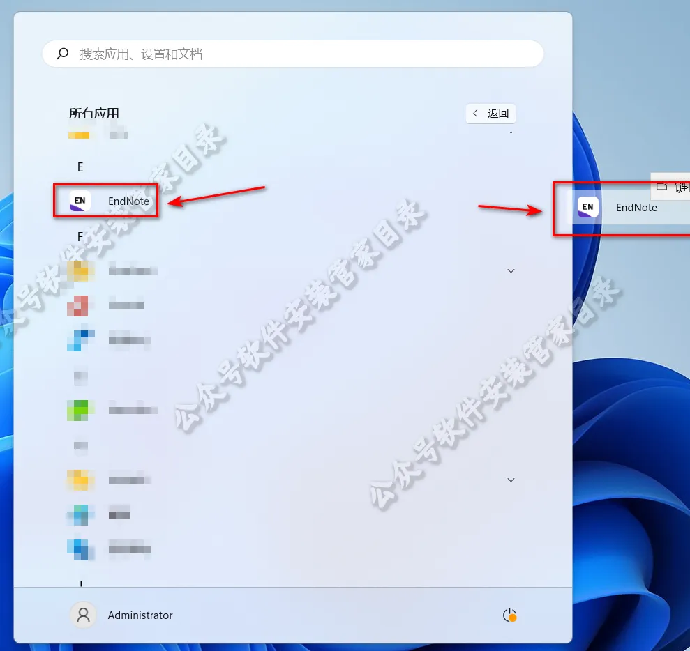 19、在电脑开始菜单找到Endnote软件图标,按住鼠标左键将软件拖动到电脑桌面