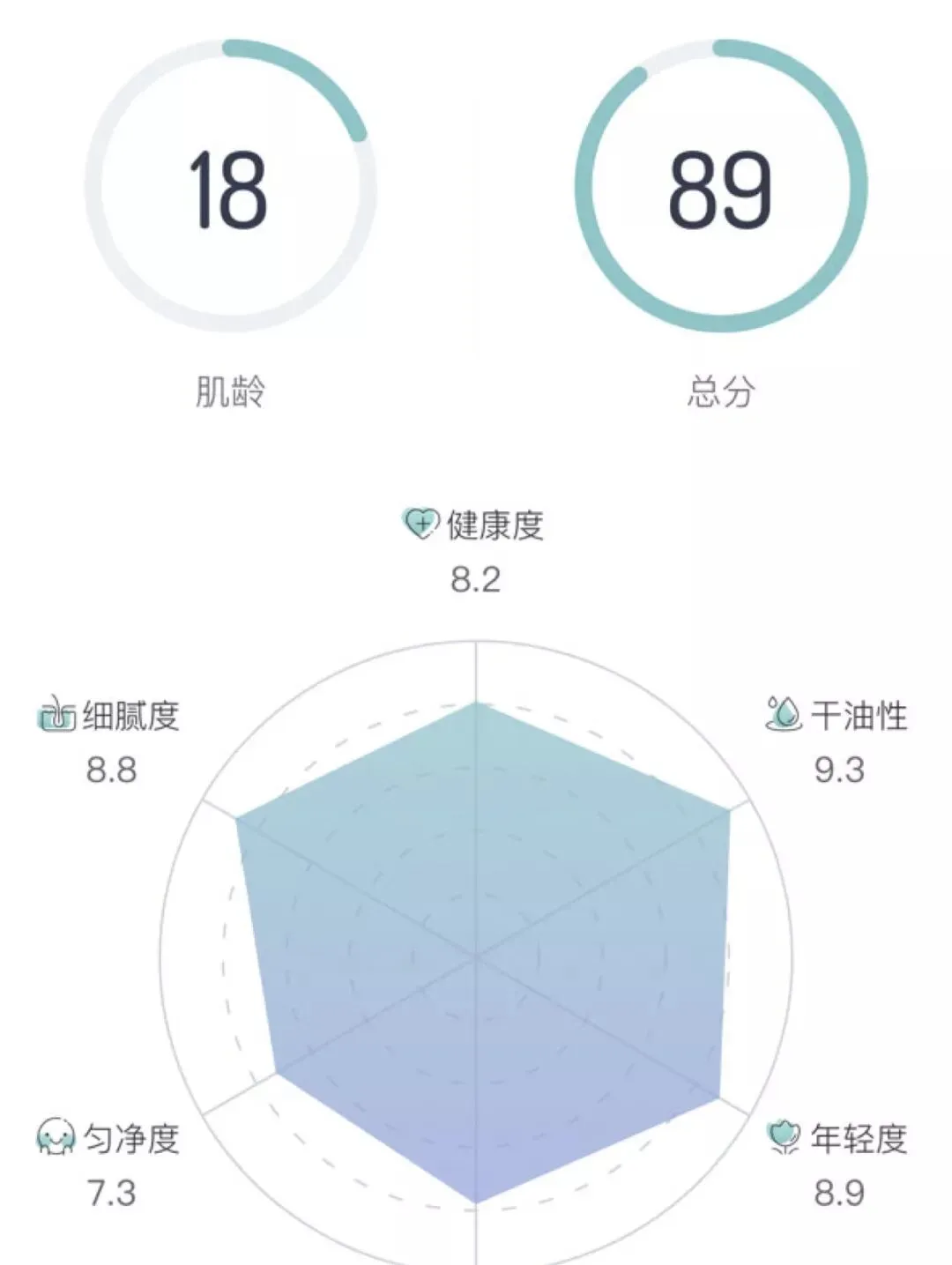 它能根据你的皮肤健康度、干油性、年龄度、耐受度、匀净度、细致度测出你的肌龄。还会根据你的整体状况给你的皮肤打分,并且保留记录,可以不断地与之前的测试进行对比。