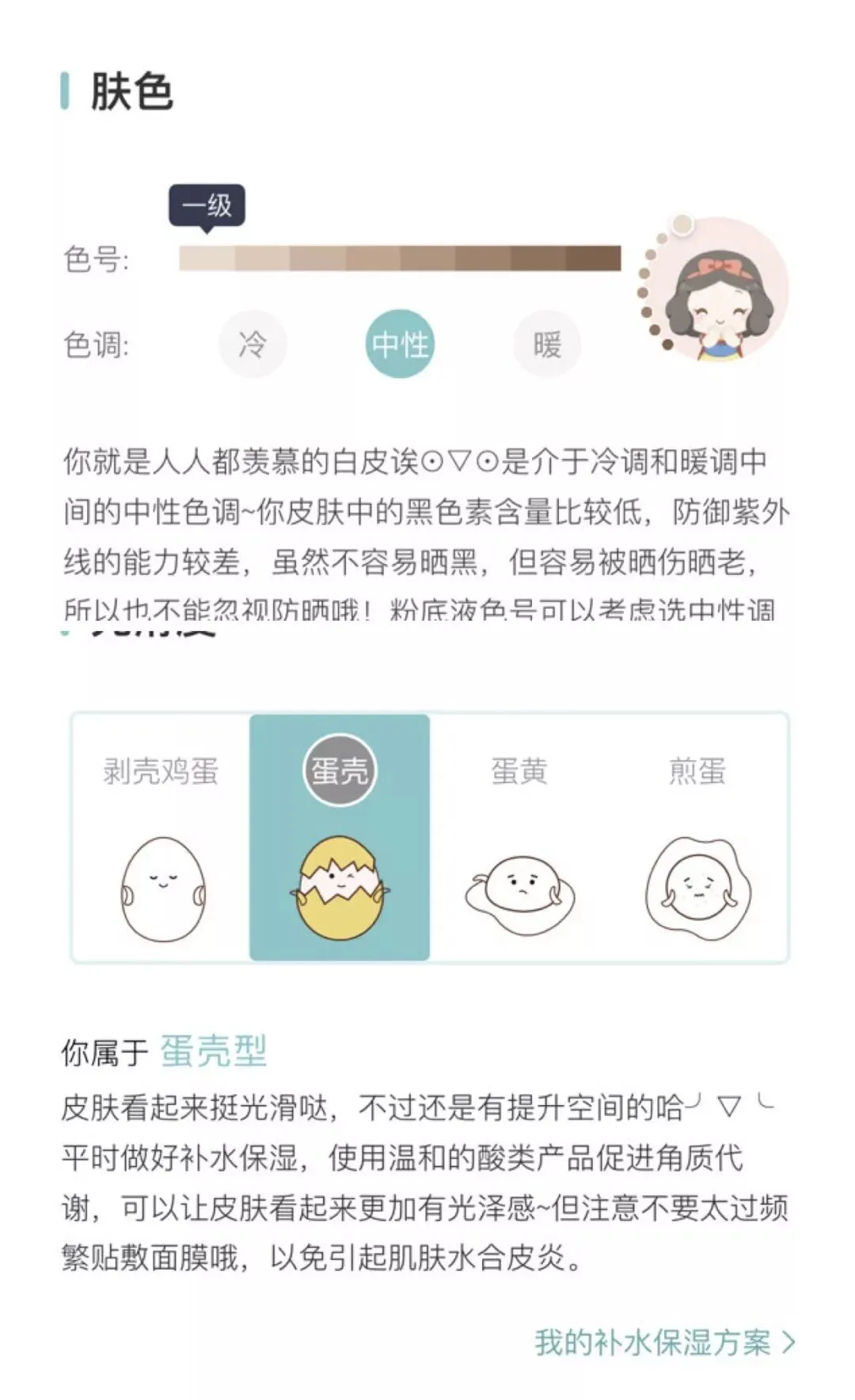 不过bug就是对于肤色的检测很不准确,而且拍照是不能检测出耐受性的。做完肤质检测别忘了去看看基于个人检测情况所定制的护肤方案,可以参考一下~