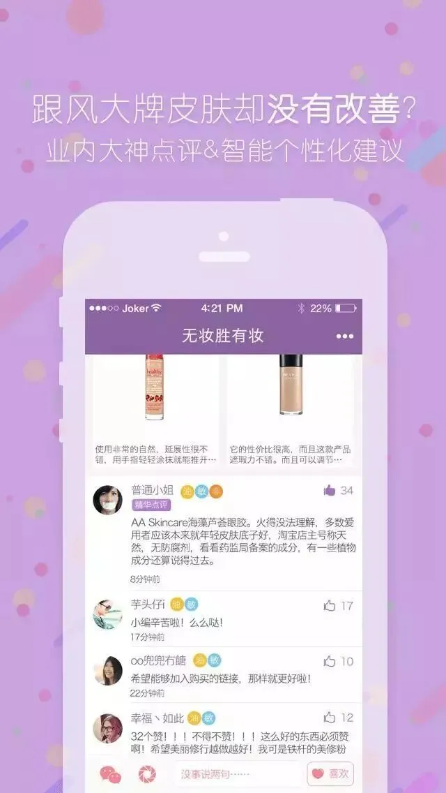 这个app完全是私人专属皮肤管理师,集检测皮肤、定制个性化护肤方案、看护肤功课及查成分表于一体。从操作界面来说,清爽简单,各种功能都很实用!