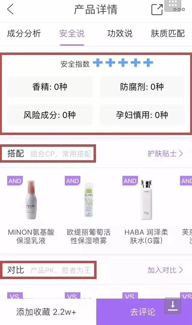 查询完某个产品,你还能通过它来查看相应搭配的护肤品,也可以对比相似产品看看哪个更适合你,十分贴心。