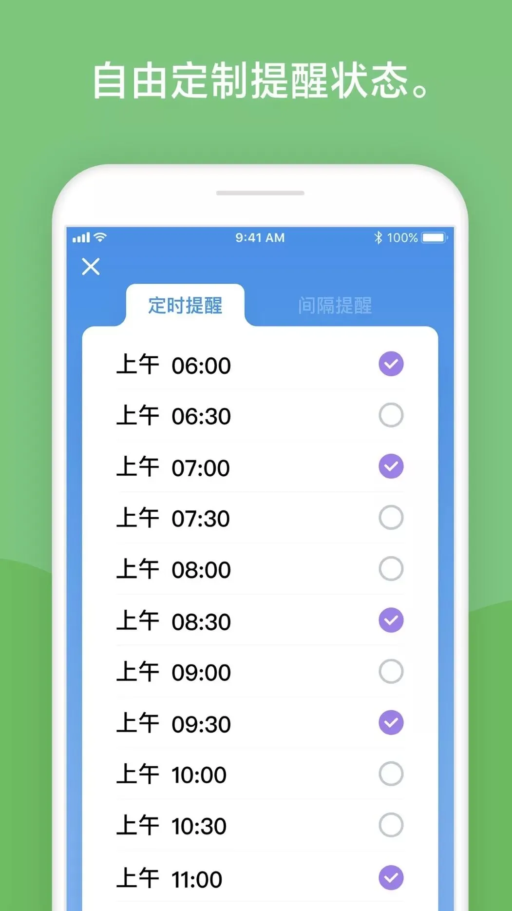 可以让app每隔一段固定时间提醒你喝水,也可以自由设定时间,在吃饭午睡工作等不方便的时候就不提醒,省去不必要的麻烦。