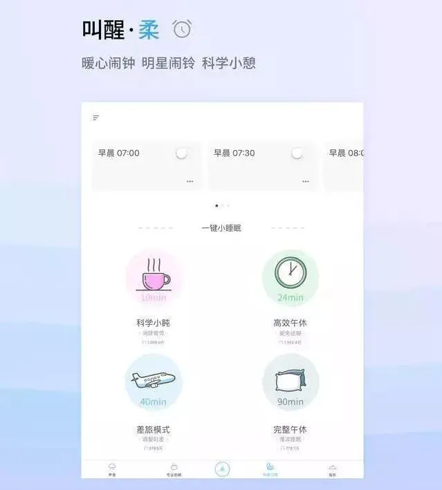 需要调整生物钟的时差党和熬夜党适合“差旅模式”,而“高效午休”和“完整午休”模式则安利给上班族或者学生党,可以让人在比较短的午休时间里获得一个高质量睡眠。