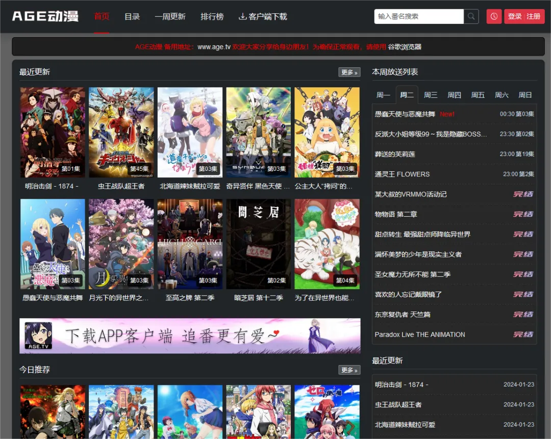 AGE动漫,专为二次元漫画爱好者所打造。所有动漫资源均为高清画质。支持多种线路播放,更可自由下载。同时提供百度网盘下载通道。资源丰富,涵盖全面。每日提供热门动漫推荐,每周更新清单,便于动漫爱好者快速获取最新资源。页面清晰显示集数及更新时间。平台提供安卓及苹果APP下载。内容丰富,更新迅速。