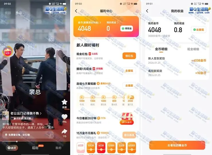下载打开喜番免费短剧APP-底部【福利】-进去领0.8元,再领金币-第二天记得提现