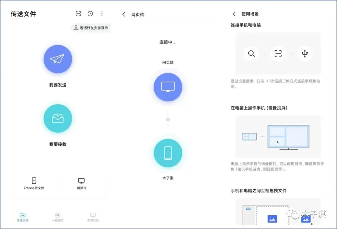 我这里以它的安卓版本为主要介绍,它支持的功能包括:传送文件、一键换机、多屏互动。