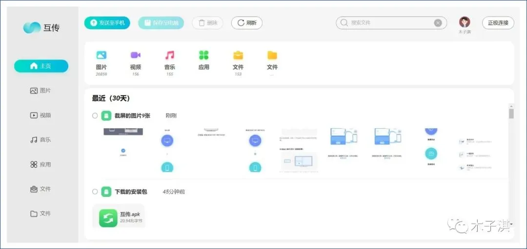 然后你可以在网页端对手机文件进行管理,手机文件按照图片、视频、音乐、应用、文件清晰分类展示。