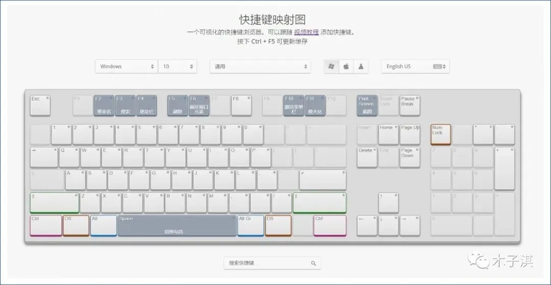 它具有可视化的特点,不同类型的快捷键以不同颜色显示,并且显示每个快捷键的用途。