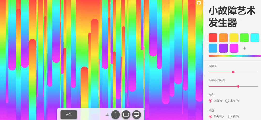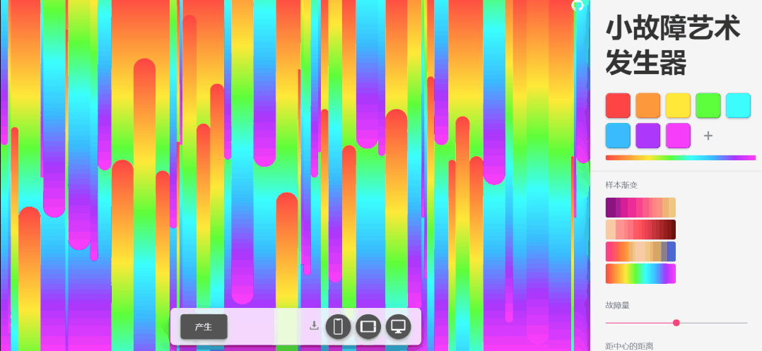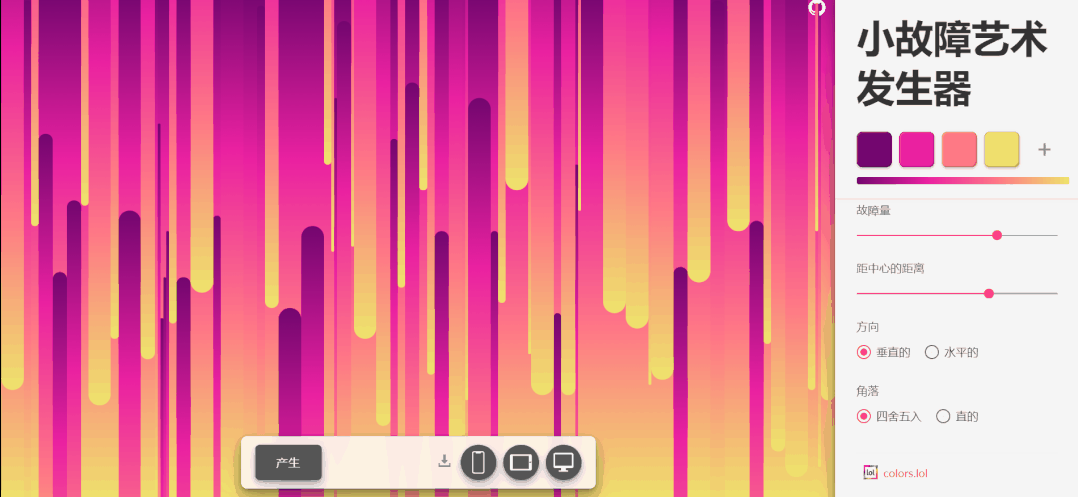 Glitch Art Generator 是一个非常炫酷的渐变条状背景生成器;它完全免费,网站提供了 4 种渐变样本,你可以点击切换查看具体效果。