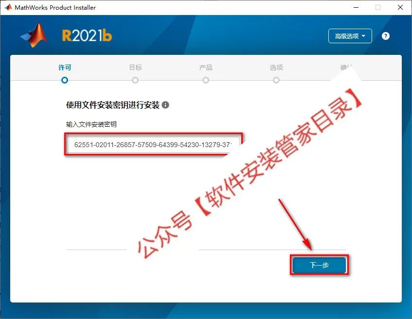 6.在输入文件安装密钥输入:50874-33247-14209-37962-45495-25133-28159-33348-18070-60881-29843-35694-31780-18077-36759-35464-51270-19436-54668-35284-27811-01134-26918-26782-54088,点击“下一步”