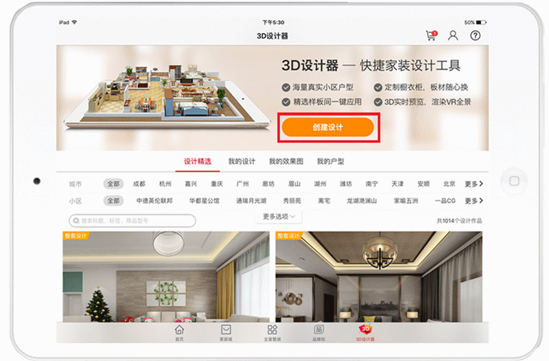 (2) 门店宝中囊括全国各地小区房屋户型,用户只需搜索自己所在城市、小区名称,找到对应的户型图,点击“创建设计”即可开始全屋设计。