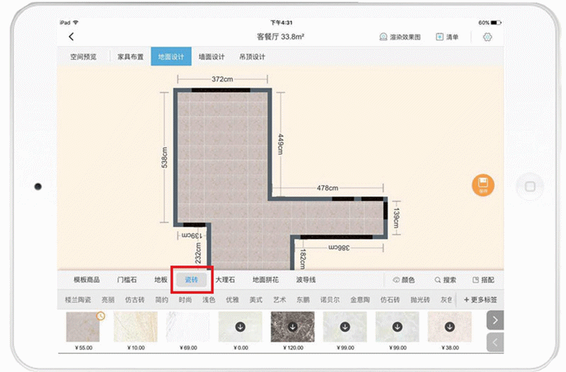 (1)点击左上角“地面设计”,进入设计界面,选择“门槛石”、“地板”、“瓷砖”、“大理石”等商品,拖入户型图内即可自动铺满。