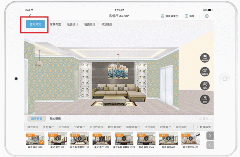 (3)在户型界面,进入任一空间(客厅),根据自己心仪的风格选择模板进行应用。