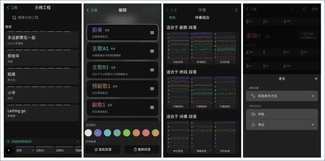 它支持强大的曲谱编辑功能,包括:和声进行、速度节拍、段落小节、拆分段落、复制小节、删除小节、复制段落、删除段落,你可以自由创作;它支持智能曲谱跟随,你可以居家练习、现场演奏。