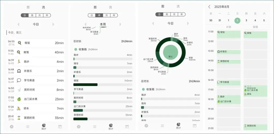 它支持统计板块,按照事件的时间顺序展示你的所有活动,按照事件的时间花费展示你的所有活动,还有精美的图表展示。