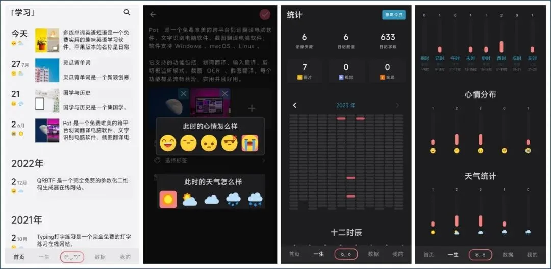 第二个板块也就是数据统计板块,包括:记录天数、日记数量、日记字数、图片文件、视频文件、音频文件、日期分布、时间分布、心情分布、天气统计。