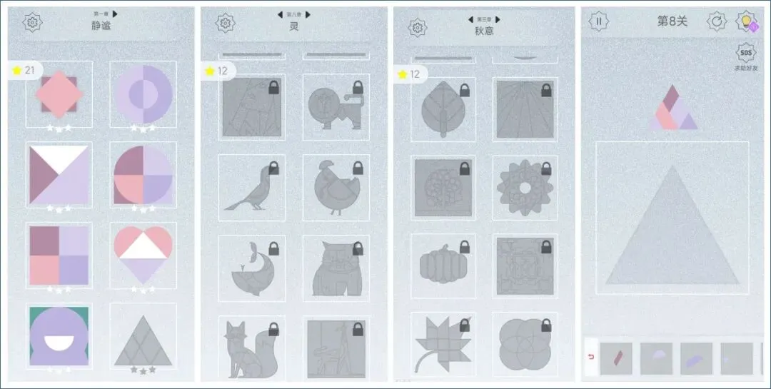 它需要你仔细思考,多次尝试,有些复杂的图形例如动物图形,有很多个拼图碎片,你需要考虑碎片放置的先后顺序,然后旋转碎片的方向,将多个碎片拼接成正确的图形。