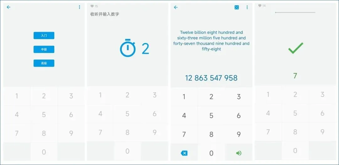 它支持游戏训练,支持多种难度,你需要在规定的时间内,根据英语发音点击输入正确的数字。