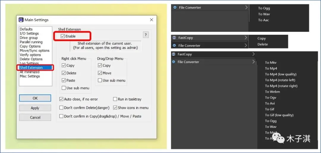 点击 Option 按钮,点击 Main Settings 按钮,找到 Shell Extension 选项,勾选 Enable 选项,就可以选中需要复制的文件然后鼠标右键找到这个软件的复制功能。