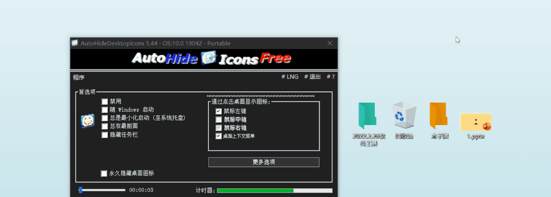 它支持丰富的设置选项,包括:鼠标没有动作后多长时间自动隐藏桌面图标、通过点击鼠标左键再次显示图标、通过点击鼠标中键再次显示图标、通过点击鼠标右键再次显示图标、鼠标在桌面移动时显示图标。