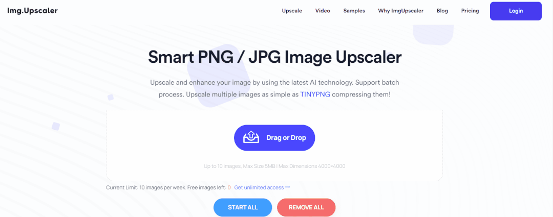 它主要的功能是让图片无损放大,让图片变得更加清晰;它不需要注册登录,操作非常简单,上传或者拖动图片,支持批量处理图片,点击开始按钮就可以开始处理。