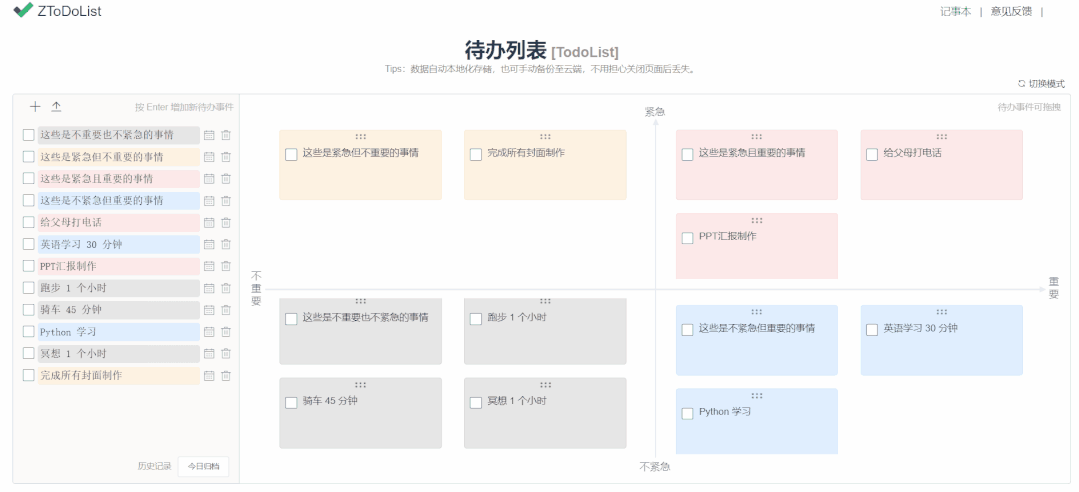 它支持新增待办功能,支持鼠标拖拽待办事项到其它区域、支持 2 种待办事项展示模式。