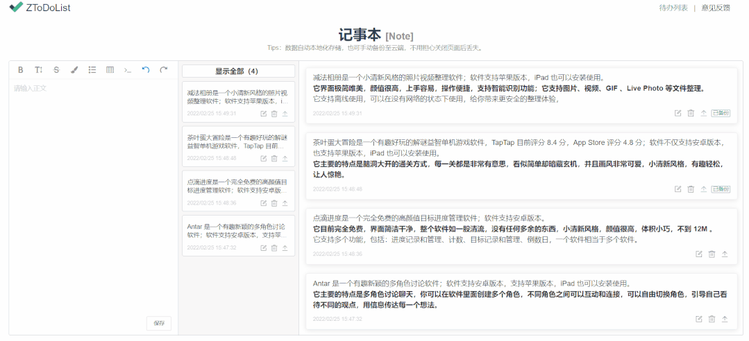 它目前是完全免费的,界面极简,简约唯美,小清新风格,颜值很高,支持在线待办列表和在线记事本 2 个功能,支持云端备份功能。