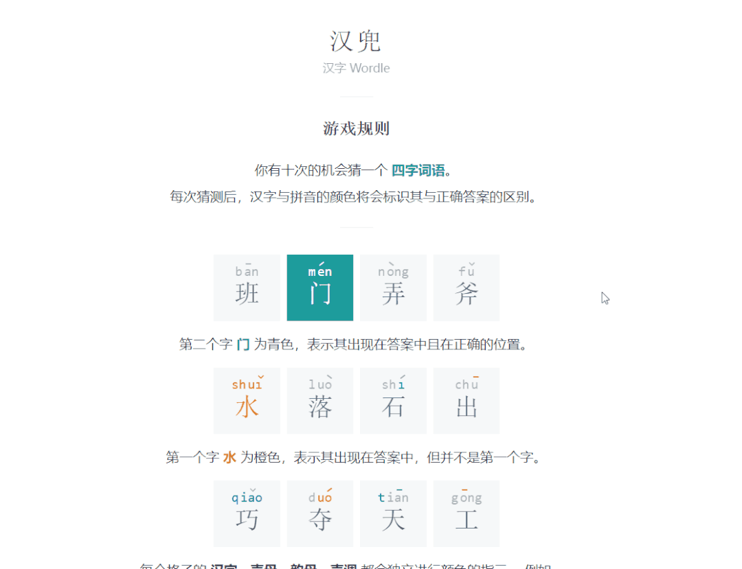 你需要仔细思考推理,每一次输入和尝试都可以进一步接近答案,例如知道词语中某个字的声母、韵母、声调等,因为这些也会以不同颜色进行展示。