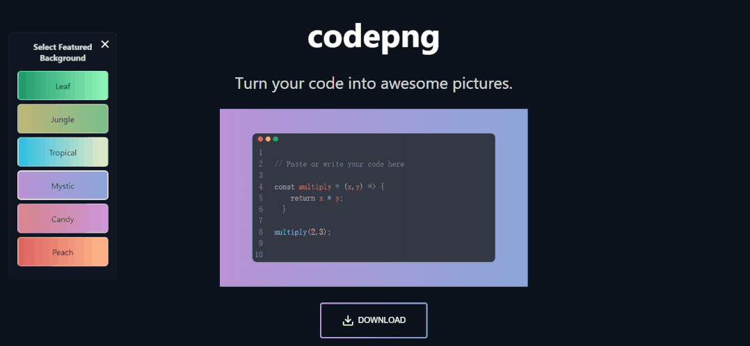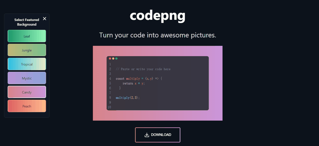 它的使用方法非常简单,粘贴代码,选择编程语言,选择背景颜色和编辑器主题,然后支持以 PNG 格式一键下载生成的精美代码图片。