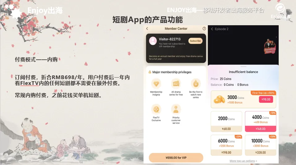 我们再看一下FlexTV的内购功能,FlexTV提供了698元人民币/年的订阅服务。订阅用户可以在一年内无限制地观看任何短剧,无需额外付费。