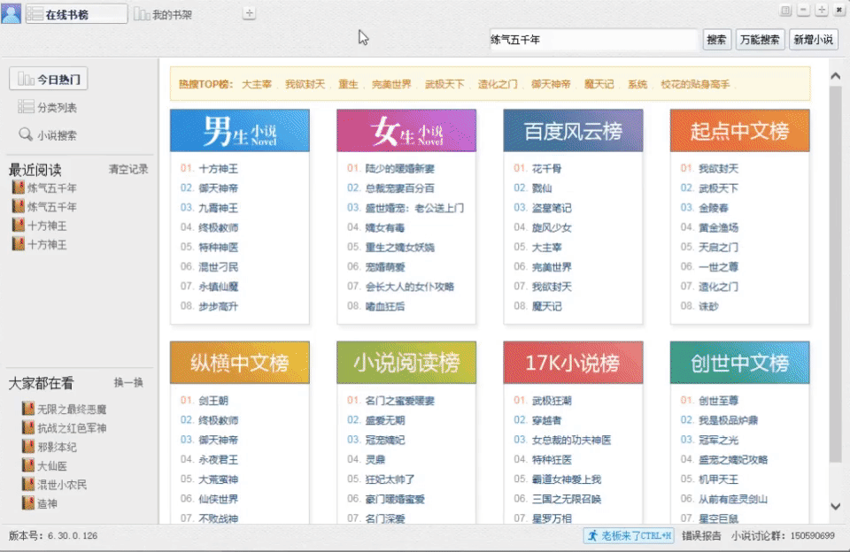 下载后,选择”NovelReader.exe“文件,无需安装,双击打开即可使用,主界面为各种排行榜,可以帮助你解决书荒问题。点击菜单可以自由切换今日热门和分类列表。
