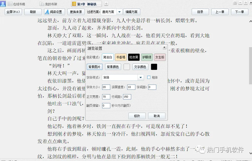 软件的阅读界面也非常人性化,可根据个人偏好进行设置,包括背景颜色、背景图片、字体颜色、字体样式、字体大小、正文宽度、行间距等。