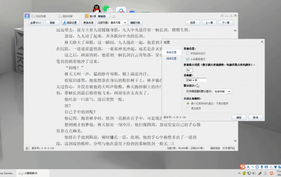另一个不得不说的功能:“老板键”?顾名思义,这个功能专门为了防老板而设定的,只要按住Ctrl+H,小说页面就能消失,甚至连任务栏里都不显示图标,完全隐藏。