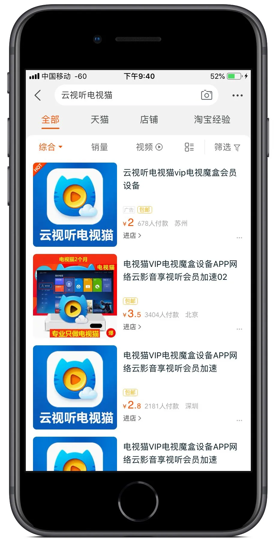 所以G先生这次要推荐一个正规的电视盒子App,这样你就不会再因为软件失效而烦恼,云视听电视猫,使用G先生提供的购买渠道在淘宝的价格只需要3.5元即可购买一个月使用套餐。另外除去此种方式,你也可以使用先生影视手机版投屏观看电影。