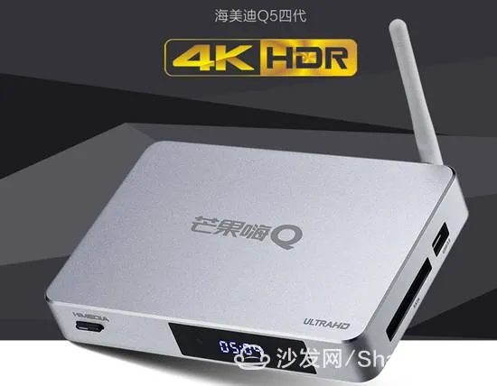 海美迪Q5四代采用的是银色金属外壳,高端气质与生俱来,采用海思64位4K定制媒体芯片,完美支持播放沙发管家里面的4K影片以及各类超清视频,支持H.265硬解码,同时支持DTS以及杜比音效解码输出,让你体验立体环绕式原声,如同亲临现场,五位一体全方位画质提升,畅享高清蓝光画质,图像模式自适应调节,始终保持舒适的视觉效果。海量芒果TV正版内容,拥有各大卫视热播剧集播放权,韩剧美剧港台剧,芒果独播剧实时更新,购机送会员,高清流畅无广告。