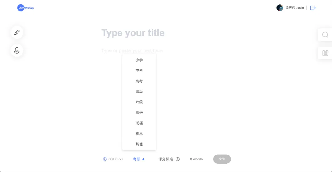 2)备考四级、六级、考研、托福、雅思等英语考试写作,预算有限的同学。“爱写作”的计时器、字数统计、评分标准、检查工具可以帮助这部分同学模拟考试环境,并在练习中熟悉相应的考试。两项查询工具也能帮助大家提高写作效率,熟悉写作中的高频、必备表达。