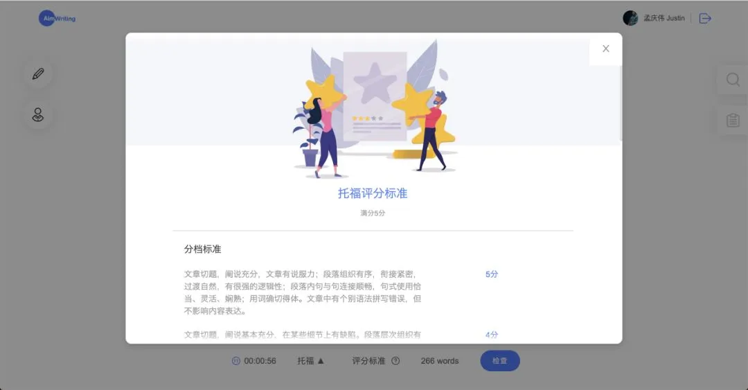 点击“评分标准”旁的问号,就可以看到所选类型的评分标准。以“托福”作文为例: