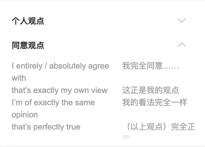 除此之外,还有一些分类严格来说并不属于逻辑连接词,但却是学生在写作中必备的表达,也整理出来了,比如“个人观点”、“同意观点”(如下图)、“不同意观点”、“兴趣或计划”、“缺少兴趣”。这个设计非常贴心。