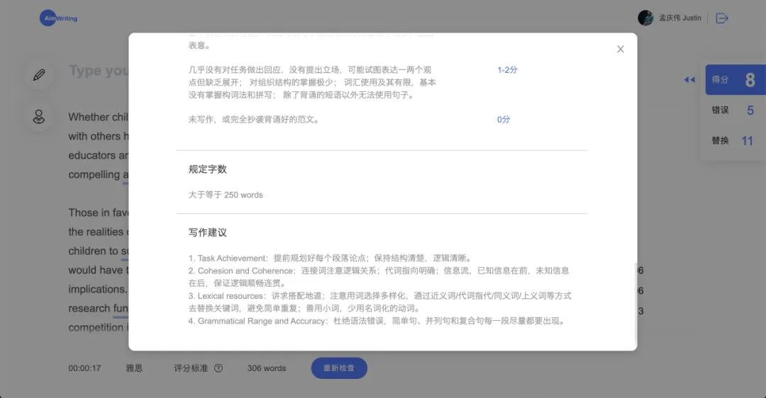 “爱写作”目前支持国内常见的八大英语考试类型(小学、中考、高考、四级、六级、考研、托福、雅思)。在不同的考试模式中,系统会根据每一类型考试特定的评分标准和写作要求,有针对性地给出反馈建议。