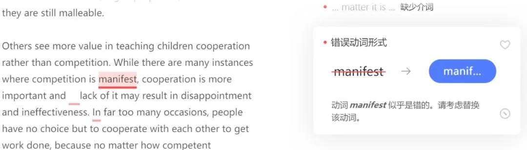 “爱写作”指出,这里的 manifest 需要改成 manifested。manifest 有动词和形容词两种词性,文中的 manifest 用作形容词。说明“爱写作”在进行作文批改时,会出现词性误判的情况。