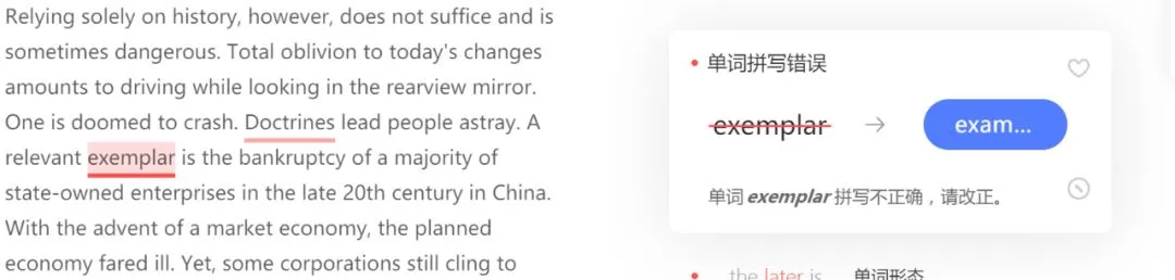 “爱写作”指出 exemplar 拼写错误,需要改成 example。exemplar 和 example 意思还是有区别的。根据《朗文当代英语词典》 ,exemplar 意为 “a good or typical example”,用在作文的语境中并无不妥。可见“爱写作”在进行单词拼写检查时可能会对一些比较不常见的词汇拼写进行误判。希望“爱写作”可以优化自己的语料库或词汇库。