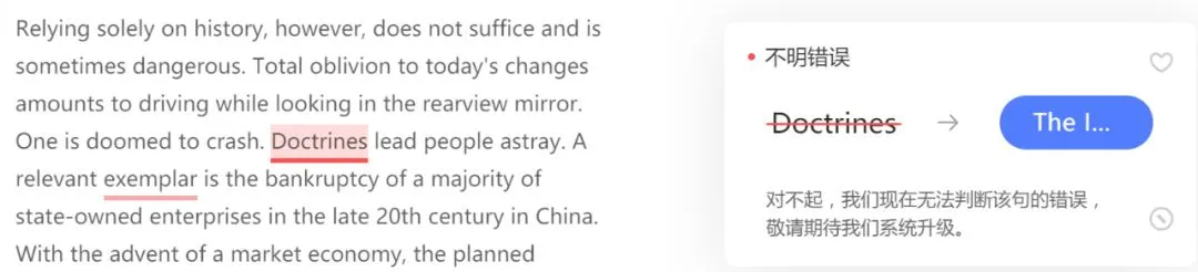 在“爱写作”给的批改反馈中,出现了“不明错误”这类反馈。也就是,系统判断这句话有错误,只是无法判断“Doctrines lead people astray”这句话错在哪里。但这句话结构非常简单,并没有语法错误。