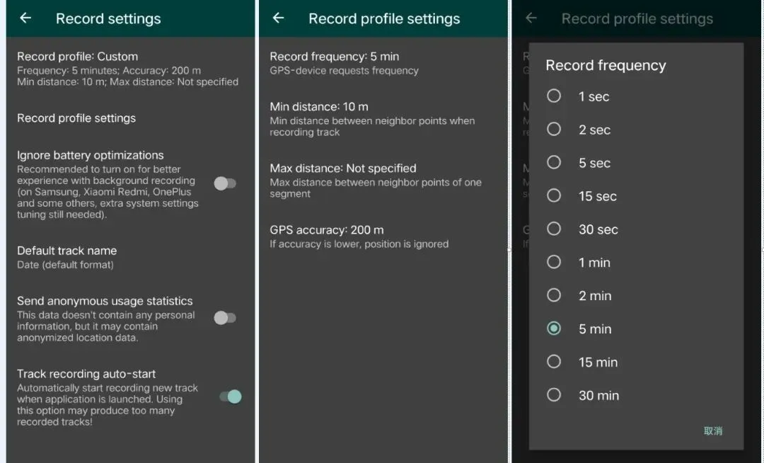 Geo Tracker可手动调节记录GPS打点的频次(1秒到30分钟)、定位精度、定位点的最小距离/最大距离都能自定义(主要为了省电)。有批量导出备份成GPX/KML/KMZ文件(PC上用奥维地图之类的都能查看详细数据)、简单易用。